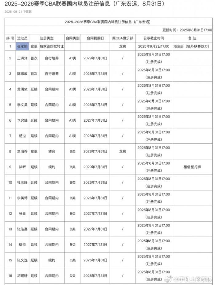 #崔永熙完成预注册#【上赛季最佳第六人!广东更新注册名单:任骏飞不在列】#任骏飞不在注册名单中#直播吧08月31日讯 CBA官网今天更新了国内球员注册信息,广东为崔永熙完成预注册。
