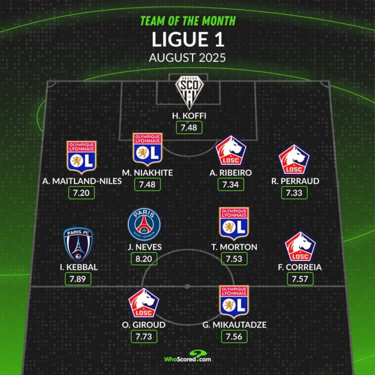 9月2日,五大联赛进入短暂间歇期,whoscored平台公布了法甲8月份评分最佳阵容,里尔与里昂各有4名球员入选。
