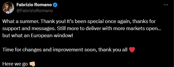 9月2日凌晨,欧洲五大联赛夏季转会窗口正式落下帷幕,知名记者罗马诺通过社交媒体向球迷致谢。